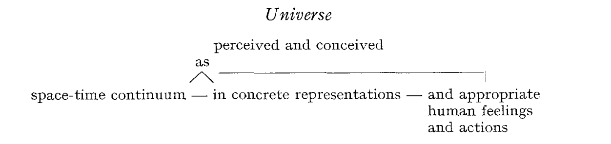 True to the characteristic intellectual thoroughness, and obeying a basic urge toward learned classification, the author of these lines observes the entire universe, all objects in the world which appears to him as perceived―kāṭci45—and conceived―karuttu46—in terms of three categories of entities (porul): mutal, karu and uri.47 Mutal, 48 or Mutaṟporuḷ, or the basic, first entities, in terms of which the phenomenal world may be described, are TIME (polutu) and SPACE (nilam). That is, the time-space continuum, the dimensions of space and time; space and time are indispensable; everything must be perceived and conceived within its time-space coordinates. Karu49 (lit. “foetus, embryo, egg, germ”, cf. DED 1074) are things (poruḷ) “born, native”, i.e. entities which appear as concrete, natural, “inborn”, “native” representations of the time-space coordinates. Uri (lit. “own, related, suitable, proper; essential”, DED* 563) are “essential, appropriate” entities, i.e. human feelings and situations “proper, appropriate” to the various time-space divisions. Schematically: