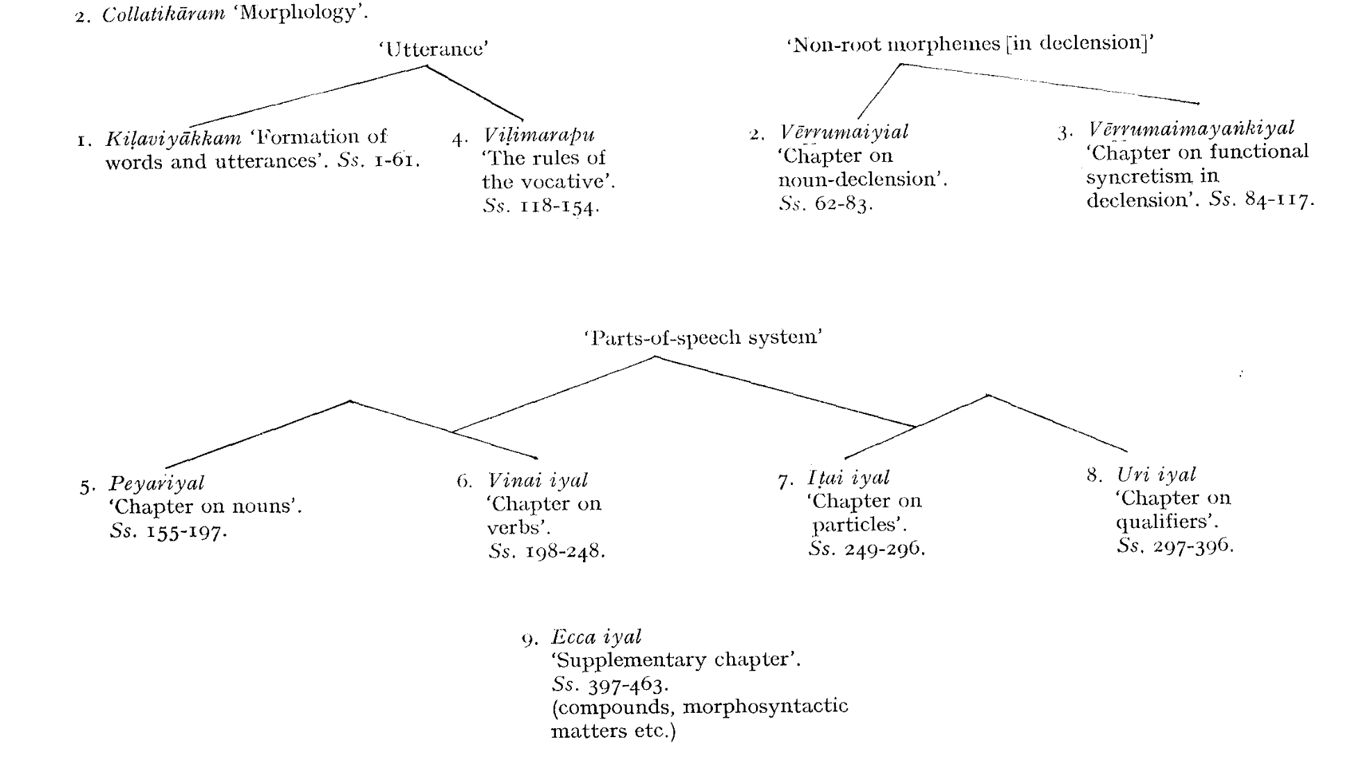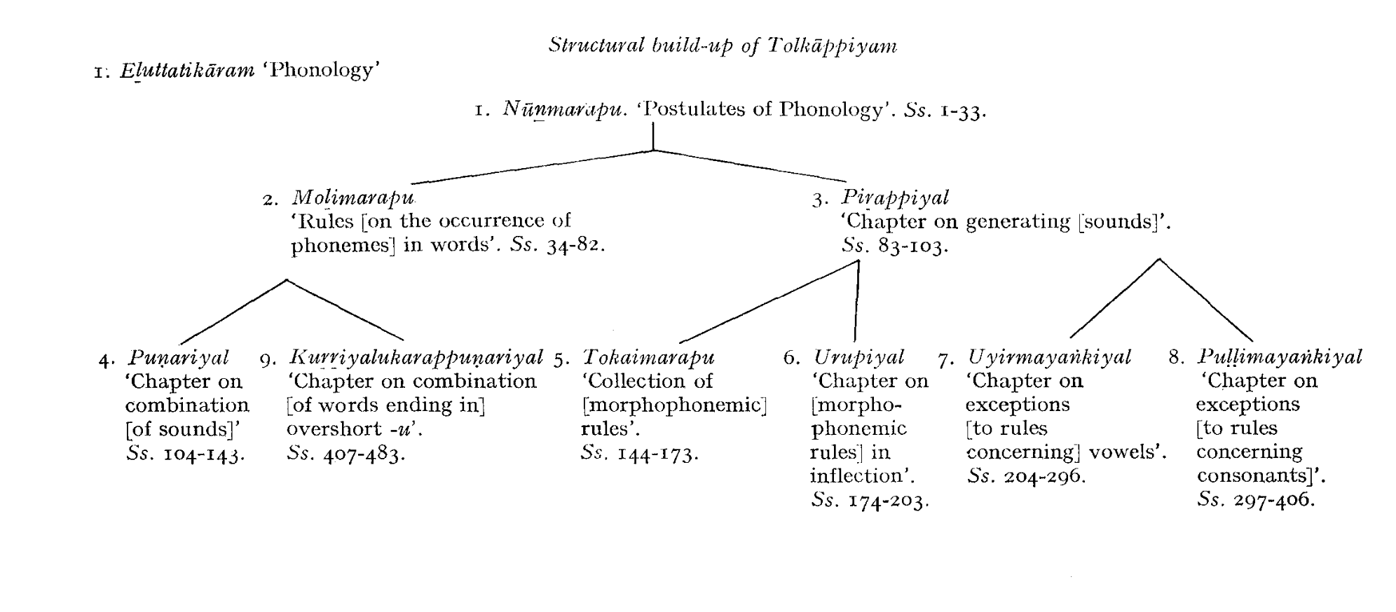 The second section is called Collatikāram, “The book about words”, and deals with etymology, morphology, semantics and syntax. Among the exciting problems emerging from the study of this book are questions of word-classes, of compounds, semantic problems, and rich lexical data. The author (or authors) had also some idea about linguistic geography of the Tamil land: standard Tamil was spoken in the centamiḻ land, and adjoining this area were the twelve dialectal regions.6