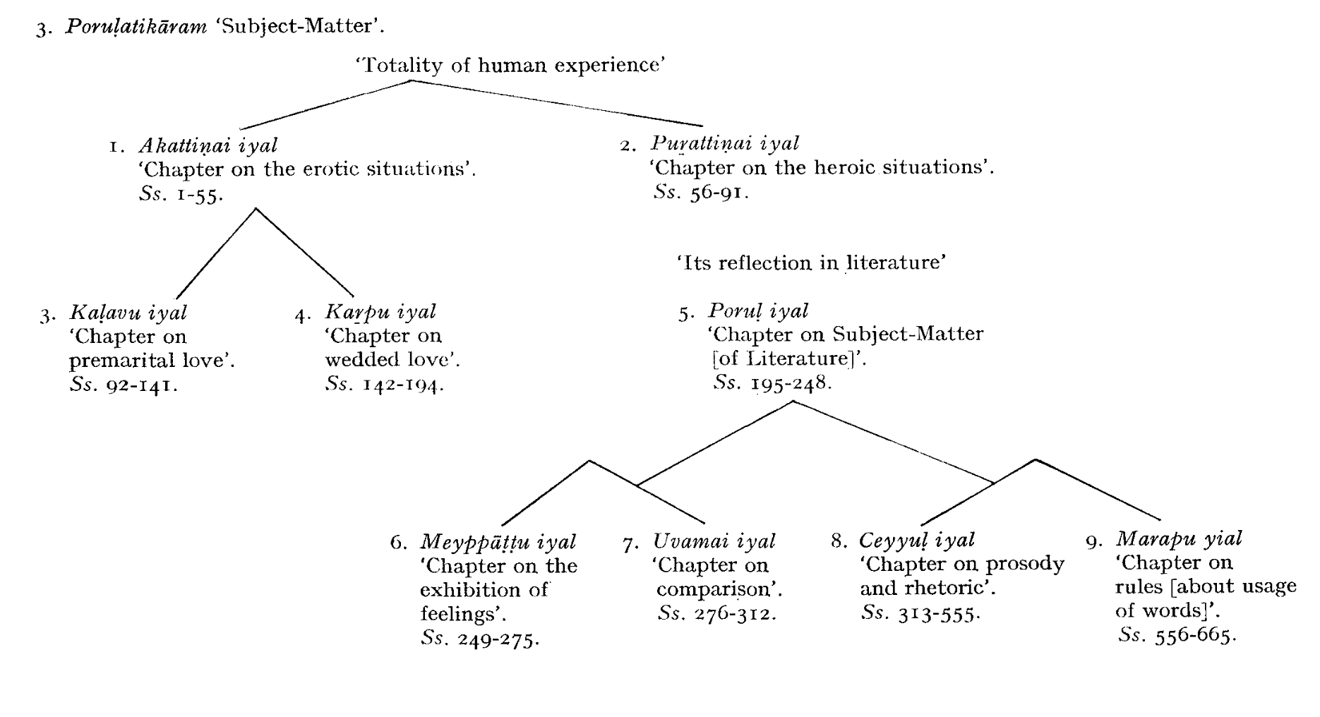 Poruḷatikāram, or the book dealing with “subject-matter” is, in short, the prosody and rhetoric of classical Tamil. In addition, it contains a wealth of sociological and cultural material.