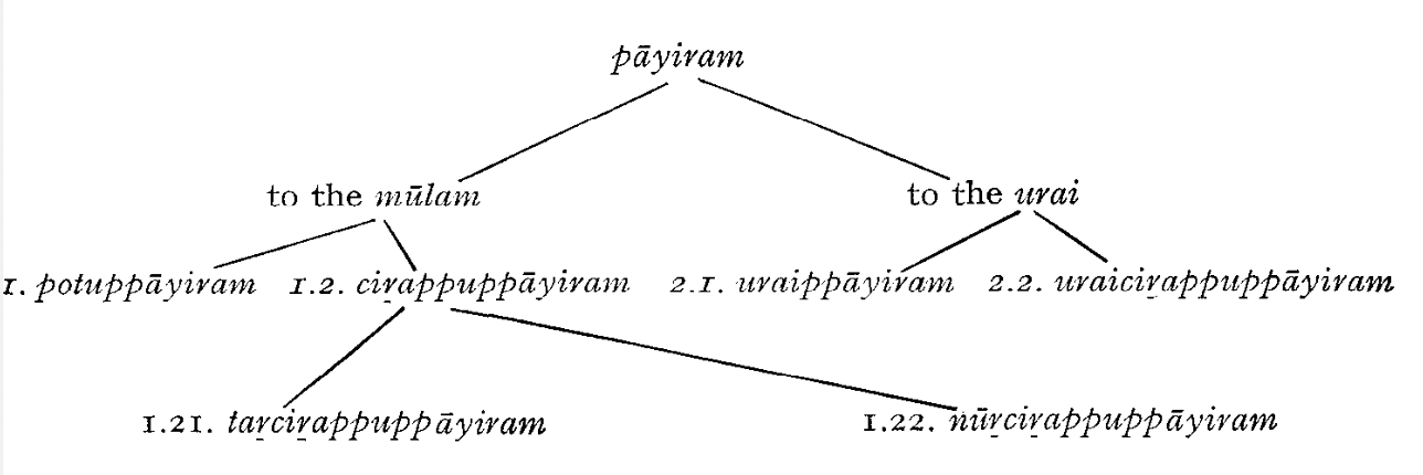 The prefatory verses-payiram (or puravurai)—to a work can also be considered as a sort of commentary since they provide information (usually embodying current oral tradition) about the author’s name, origin, education and learning, about his patron, etc.10 There are two basic types of prefatory verses: the potu pāyiram, “general preface”, and the ciṟappu pāyiram, “specific preface”. Later, however, there was some development in this genre, too, and the late medieval state of affairs may be symbolized by the following diagram:
